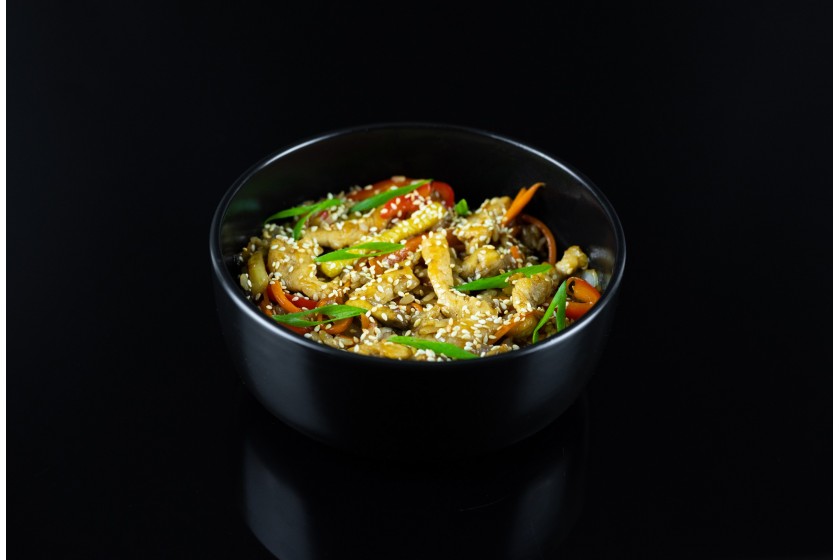 рис, куриная грудка, соевый соус устричный соус сладкий Чили соус кунжутное масло имбирь овощи (Паприка, лук, цукини, морковь, чеснок, шампиньоны) семя кунжута.